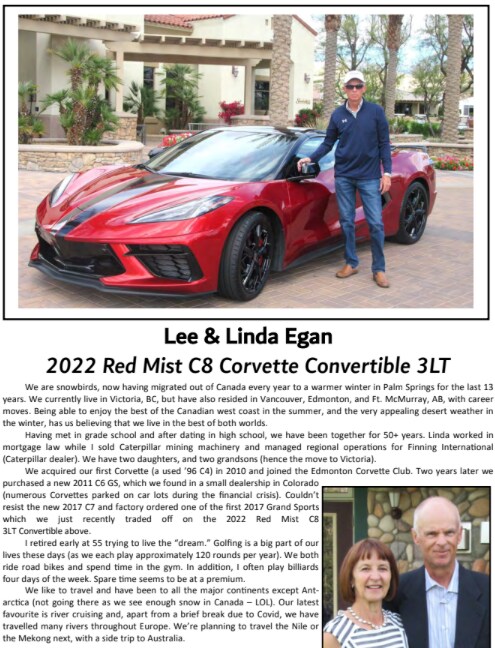 Both Stan and Brenda Moreno have been members of the PSCC since 2015. Stan has served in various leadership positions including president of the PSCC for the last 3 years and is currently activities director . Brenda's hobbies include golf, quilting, and hat burning, and she is currently serving on the board as member at large. Both Stan and Brenda were in management positions in their careers. Brenda was in healthcare and Stan was in the building industry. Retired and enjoying life together. Their first Corvette was a C5 2002 yellow convertible with a black ragtop, "The bumblebee". In 2019 they bought Stan's birthday gift on the showroom floor a C7 Sebring orange convertible with Kalahari Brown ragtop and named her"ADTEQLA". Then they just bought a brand new 2026 convertible e-ray named "Bumblebee 2." Congratulations Stan and Brenda with our first 2026 car of the club, what a way to start off the new Year! |